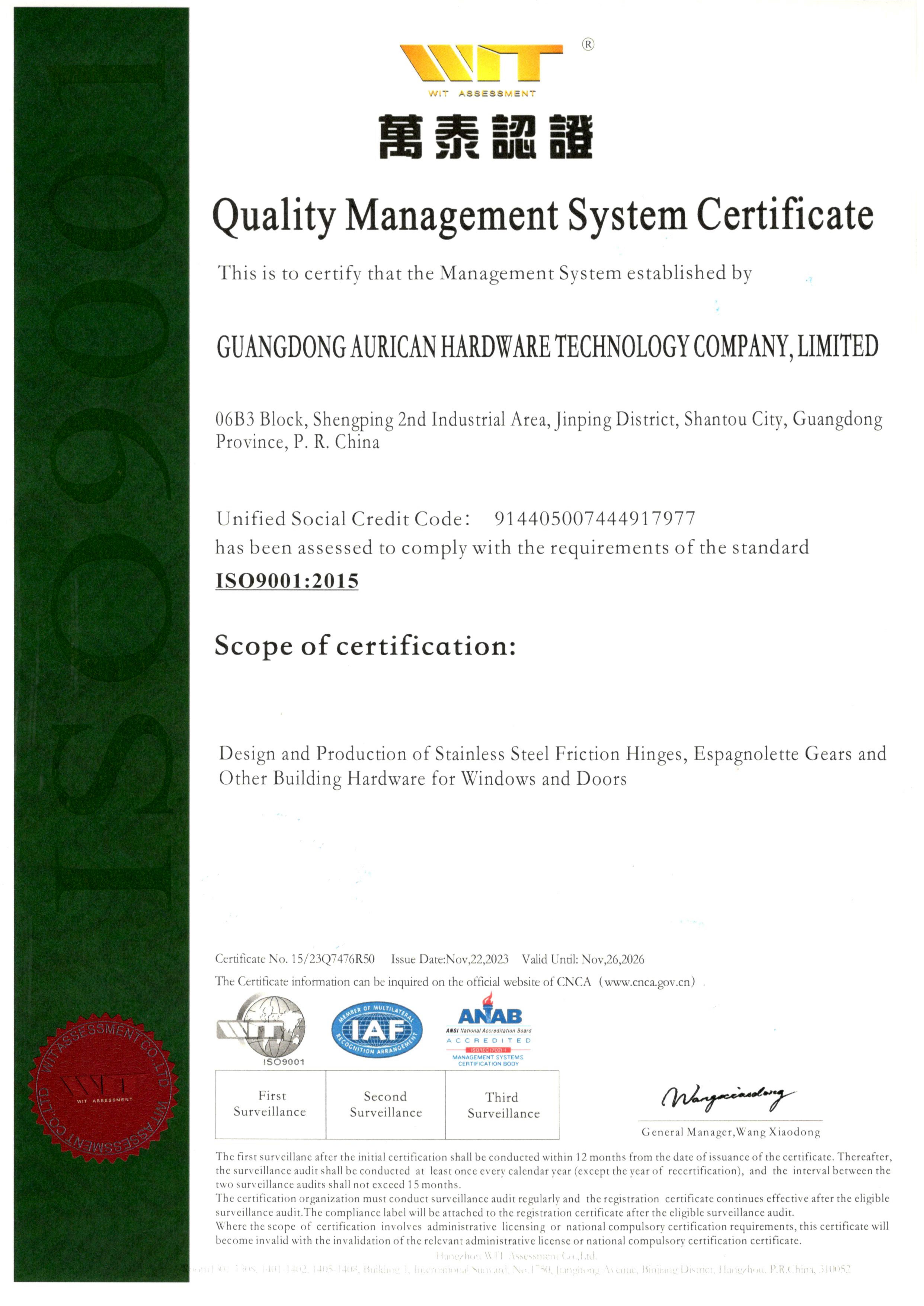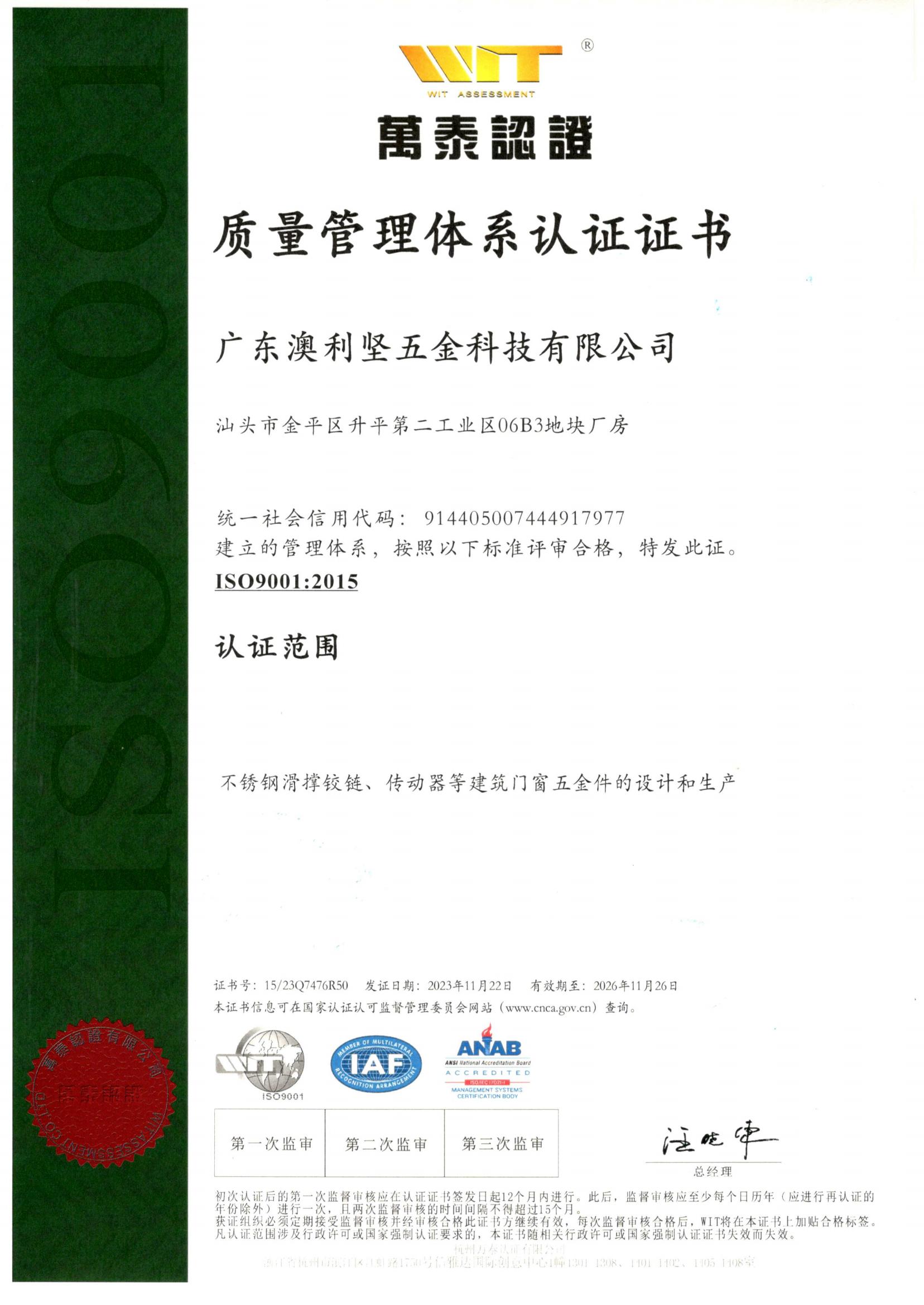 ISO9001:質(zhì)量管理體系認(rèn)證證書 -