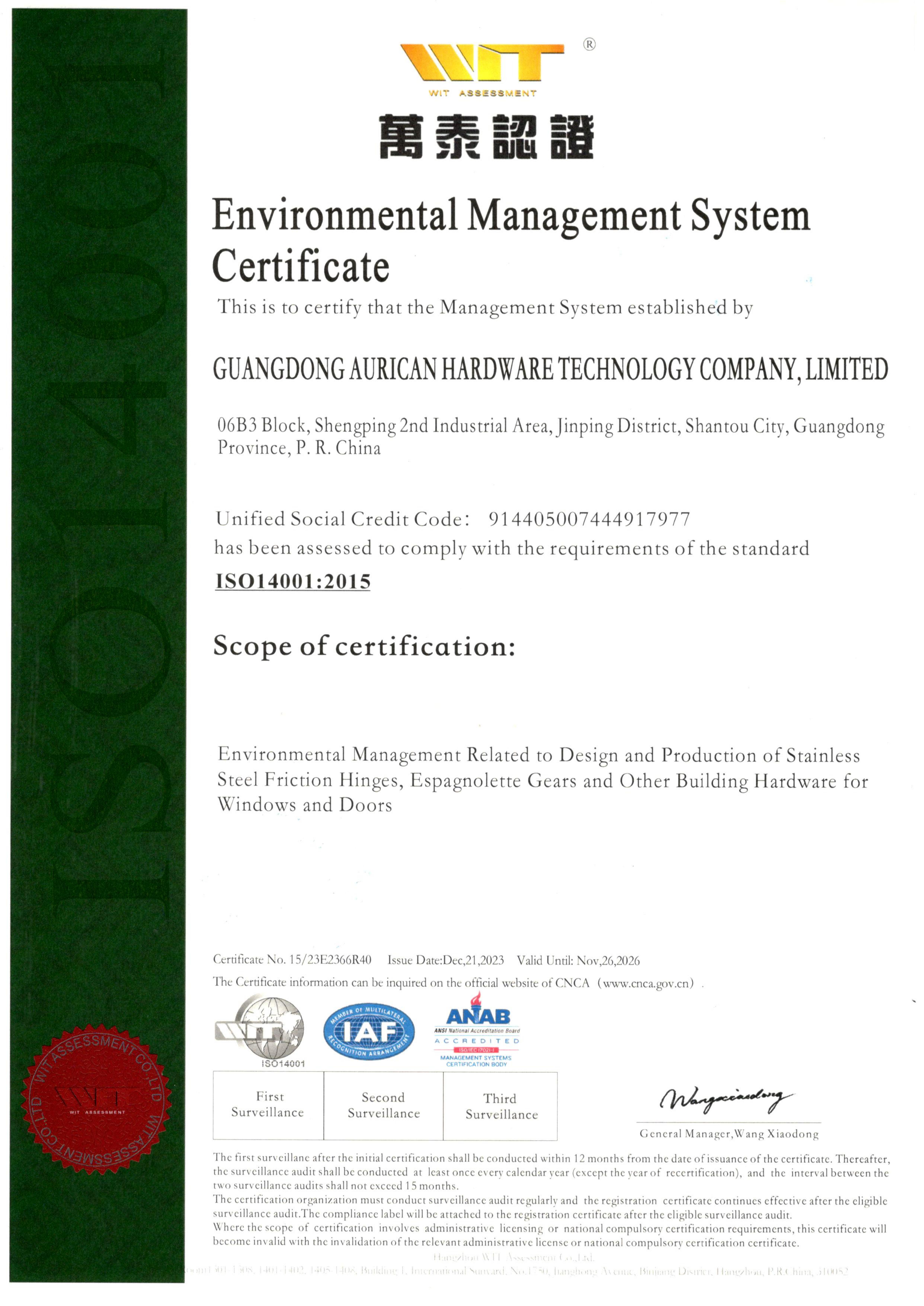 ISO14001:環(huán)境管理體系認(rèn)證證書 -
